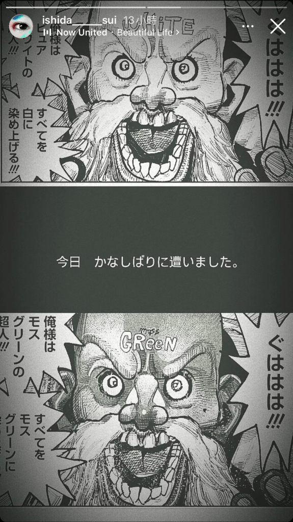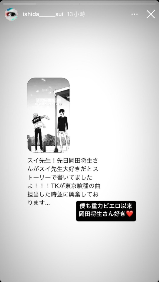 Sui sensei! A few days ago Masaki Okada wrote on his story that he loves you!!! I’m as excited as when TK was in charge of Tokyo Ghoul’s music…